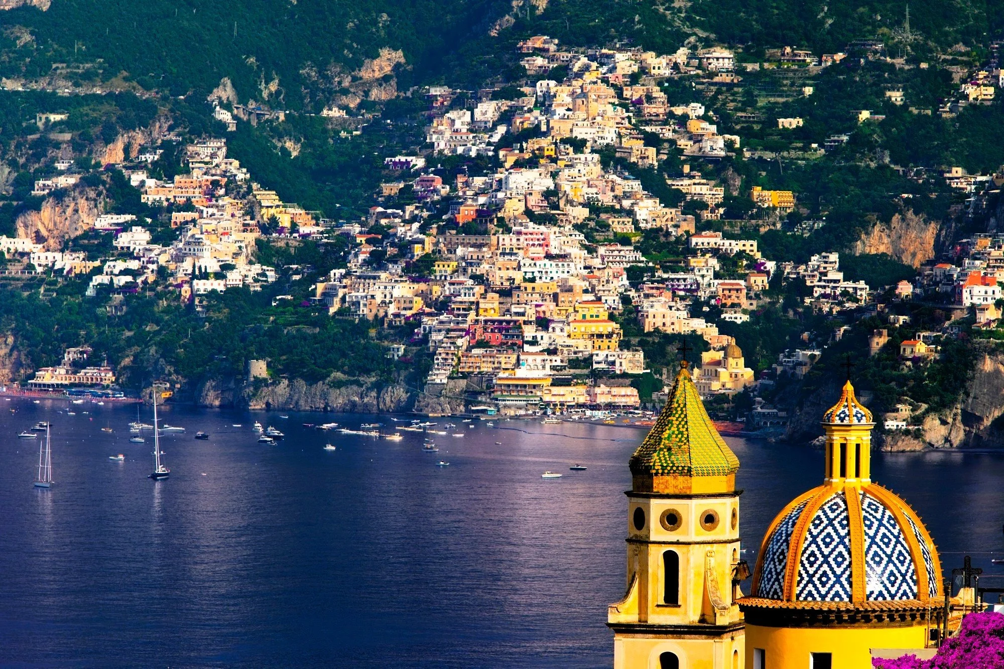 It was maritime commerce that ensured Amalfi’s survival, and the zenith of its power is reflected in its magnificent cathedral, poised amphitheatrically above the town. Its bell tower, crowned with domes of majolica in vivid yellows, greens and blues, is renowned worldwide, casting a spell over every visitor.