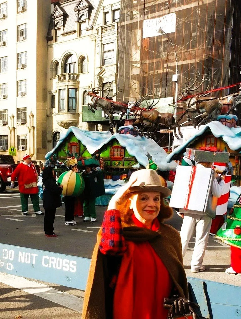 The author on Central Park West during the Thanksgiving parade, surrounded by marching bands and balloons