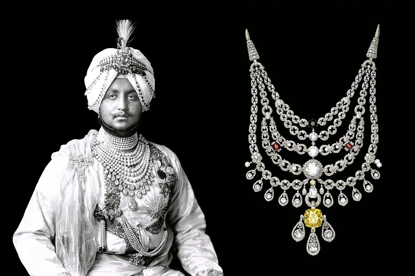 The Maharaja of Patiala in a regal posture, adorned with jewels that epitomise his prestige